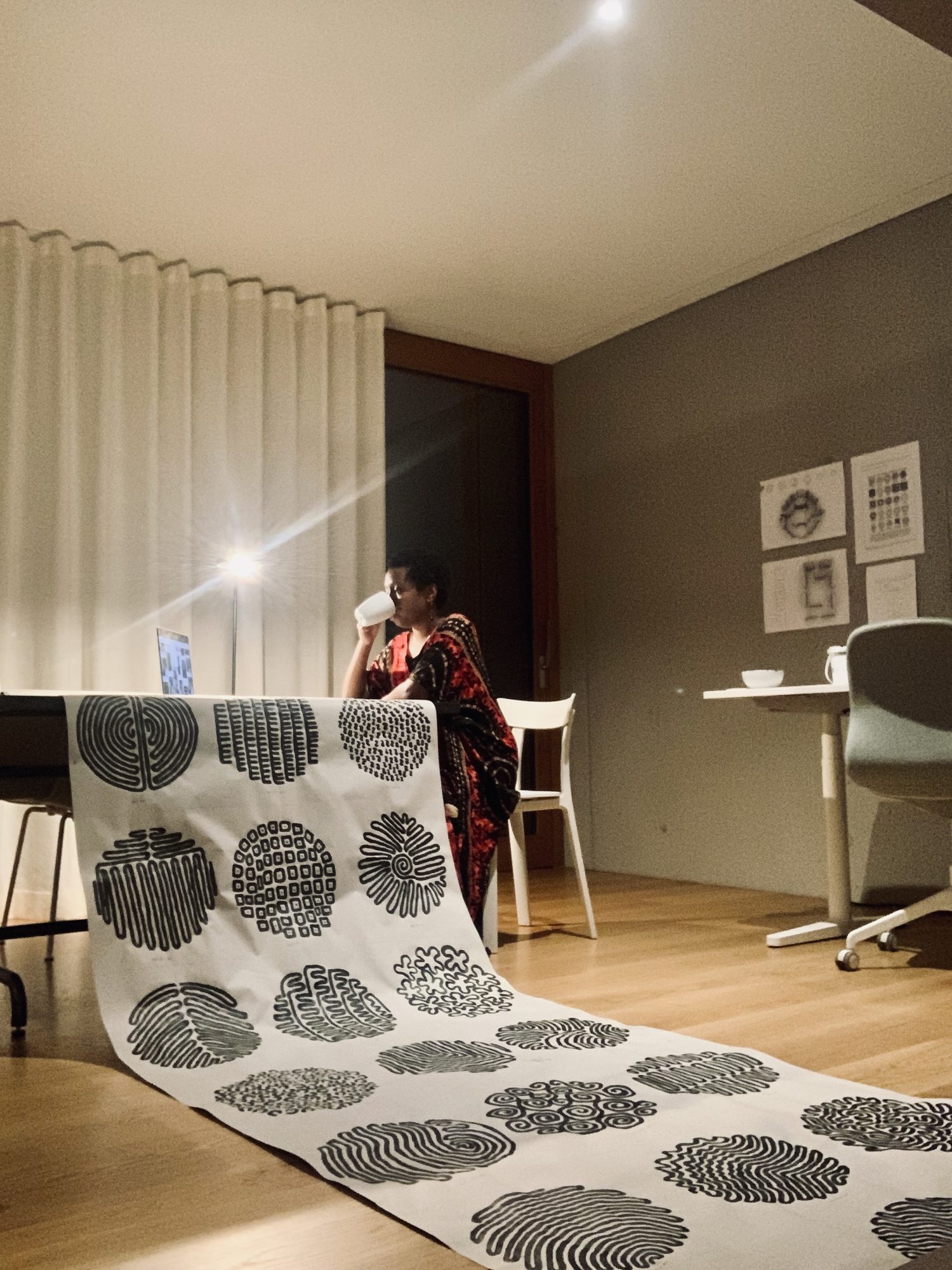 During their residency, Arafa C. Hamadi worked on their project ALTAR, an abstraction of several places, cultures and encounters, whose spatial arrangement derived from the study of labyrinths and fractals in East African ornaments and hairstyles. Arafa C. Hamadi explained, “my intention for the residency was to explore labyrinth design and its history, however I found that a lot of the reading I was doing was around European labyrinth design.” They then proceeded to research African design aesthetics and were inspired by “Ron Engel’s work identifying various applications of fractal designs throughout African urban and textile design history”. (1)