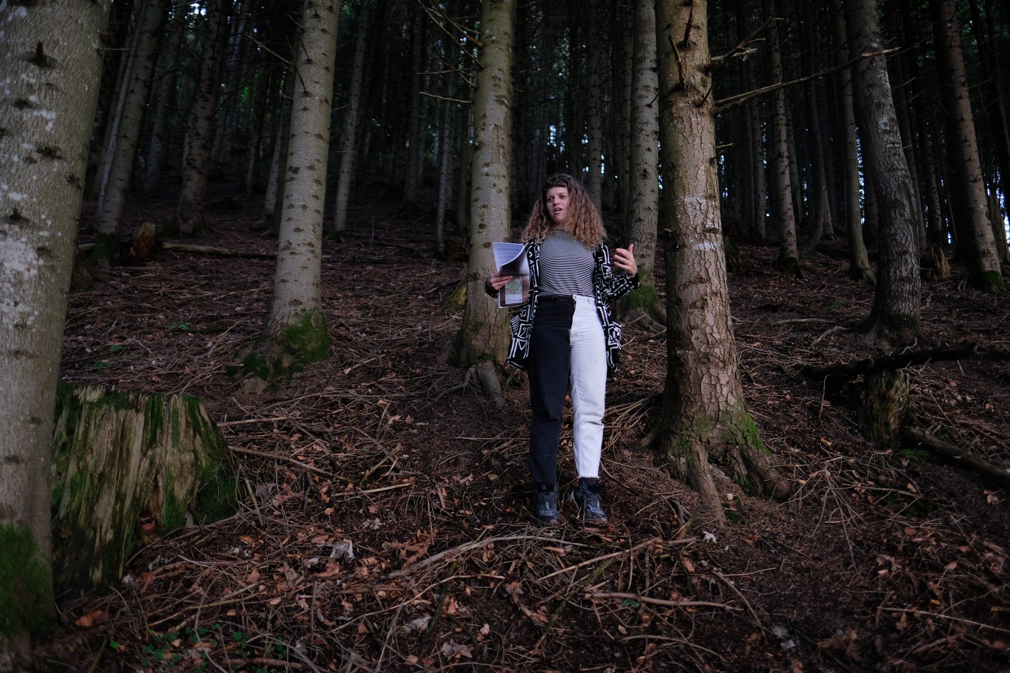 Miriam Simun followed the animals in the Jura mountains on walks and with the aid of machines, which resulted in a film essay and a lecture performance, Ghost B126 (Welcome to The Contact Zone), that took the form of a cellphone-aided guided walk in nature.