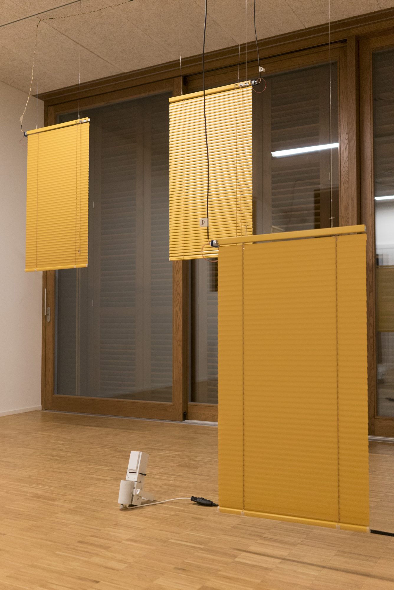Through an interplay between reflection, projection, appearance and disappearance created by the movement of blinds, visitors are invited to enter a space that is both revealing and challenging. While the projected lines emphasise the vertical and horizontal ones compose the piece, as they close, the blinds prevent one from seeing while showing shapes on their surface. The multitude of events that unfold simultaneously require concentration and a watchful eye.