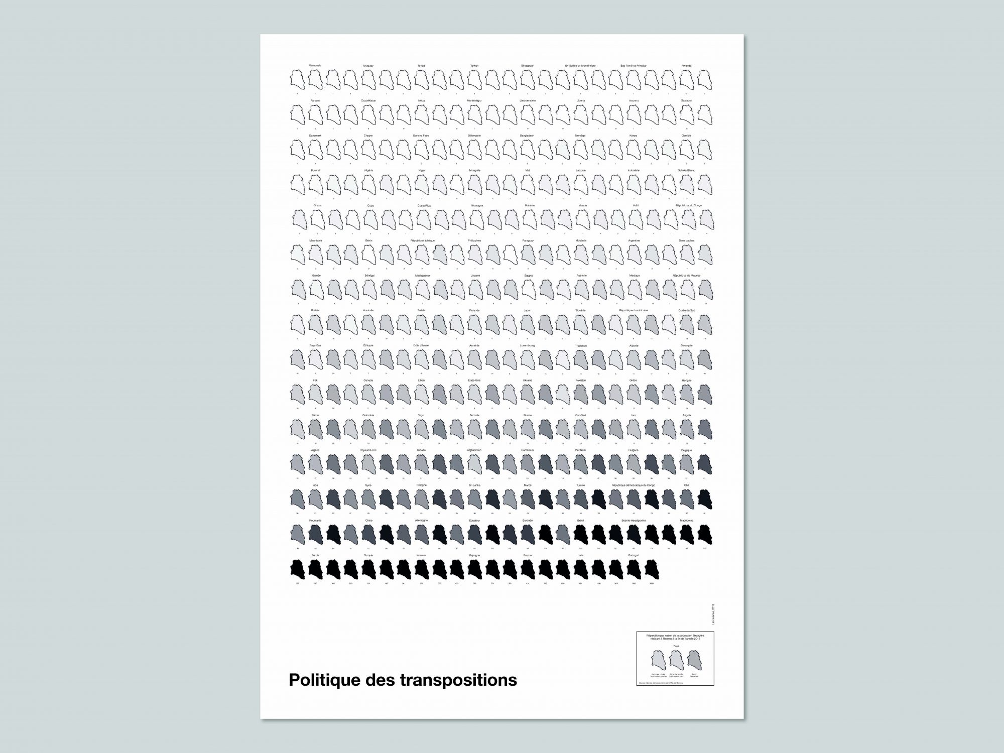 Lors de cette résidence, les Sirènes ont ainsi notamment travaillé sur le projet Politique des transpositions, à partir des statistiques des populations étrangères résidant à Renens. Ce projet a pris deux formes :