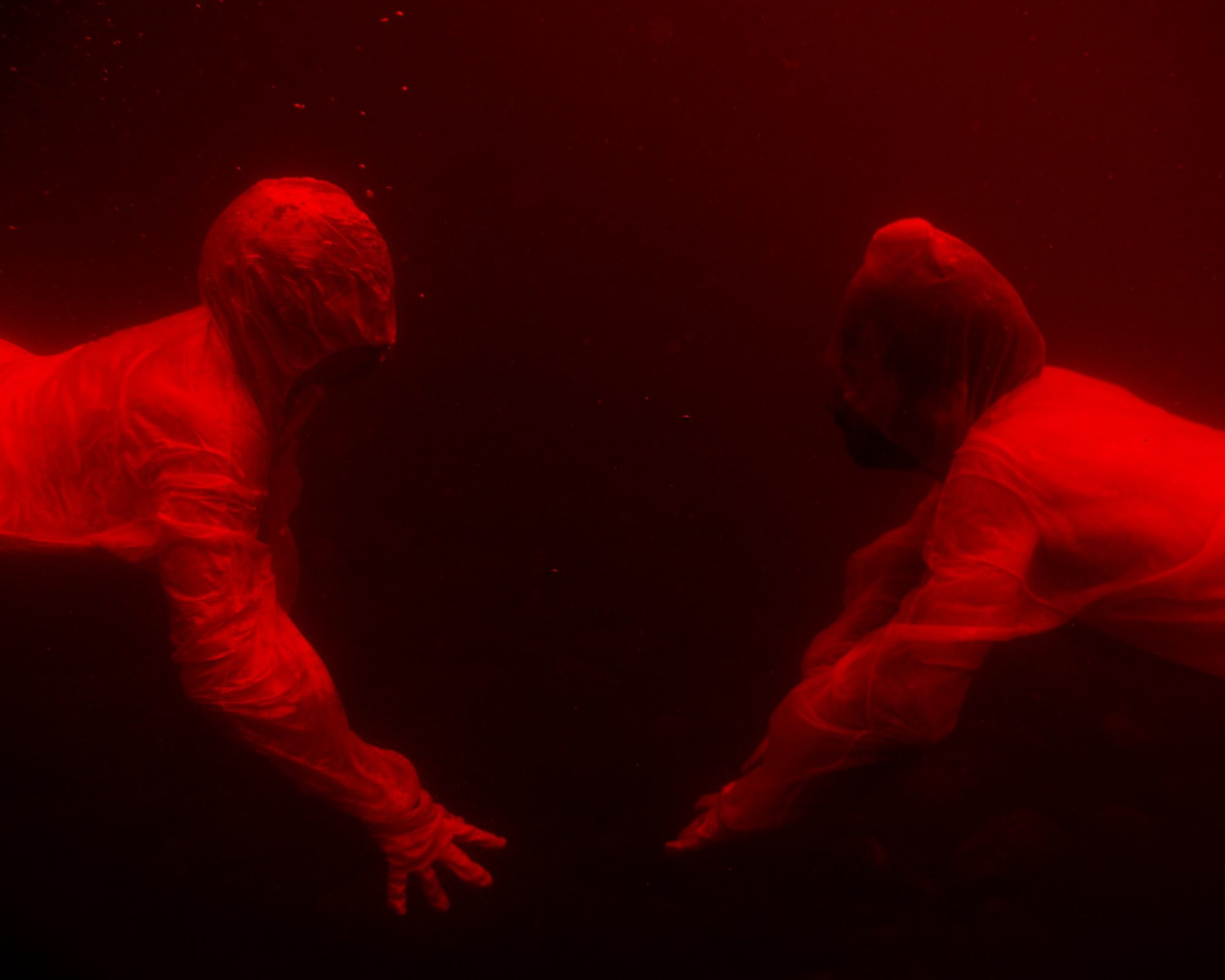 Les deux performeurs·euses doivent organiser une nouvelle économie de l’air en partageant la ressource. Il·elle sont autant dans le ventre de la planète, l’eau qui permet la vie, et un milieu hostile dans lequel s’organiser pour survivre. L’eau, le lac, deviennent les symboles de ce qui permet la vie et de ce qui vient à manquer, mettant en péril la vie même. Contraint·e·s d’entrer dans un état modifié de conscience pour économiser efforts et besoins, dépendant d’un appareillage minimal et bricolé actionnés par d’autres, il·elle ne peuvent perdre le lien à l’autre.